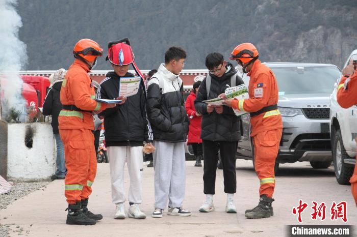 圖為森林消防員在景區(qū)重點(diǎn)區(qū)域普及防火知識(shí)?!×种ナ猩窒拦﹫D