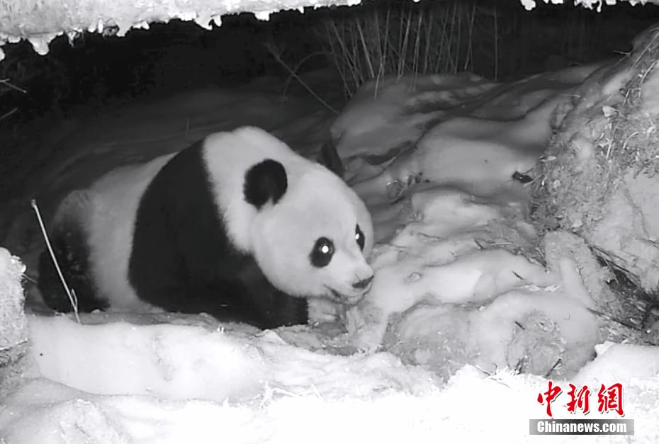 近日,大熊貓國(guó)家公園四川平武王朗片區(qū)工作人員在回收野外紅外線相機(jī)時(shí),發(fā)現(xiàn)幾段野生大熊貓?jiān)谘┑刂姓宜鹊恼滟F影像。圖為野生大熊貓?jiān)谘┑刂姓宜取?/p>