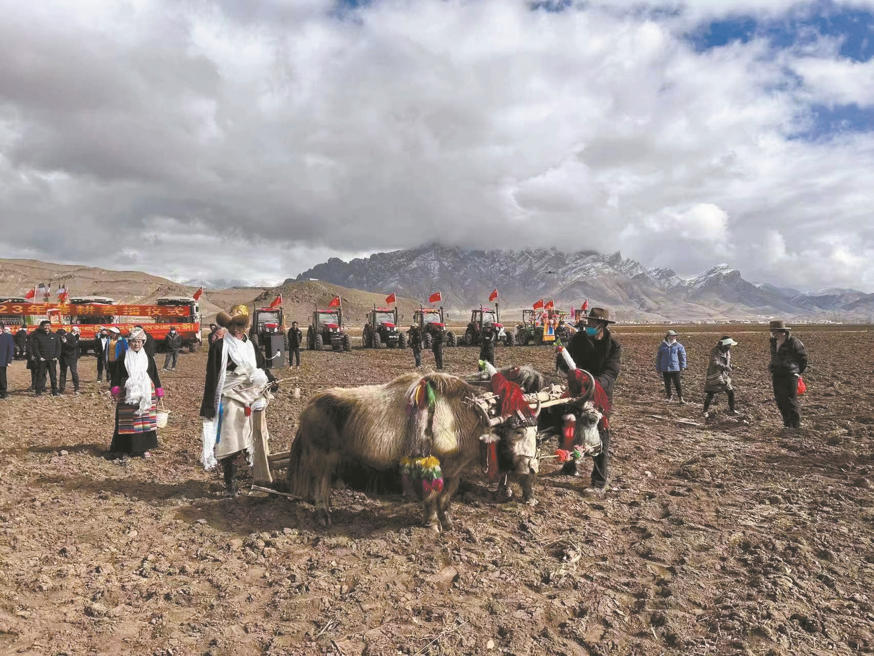 圖為在林周縣春耕春播儀式上,傳統(tǒng)農(nóng)耕方式“二牛抬杠”登場(chǎng),與機(jī)械化的“鐵?!毙纬甚r明對(duì)比。 拉薩融媒記者 劉夢(mèng)婕攝