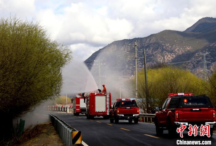 林芝市森林消防支隊(duì)消防員正在進(jìn)行灑水增濕作業(yè)?!∥骼@拉翁 攝