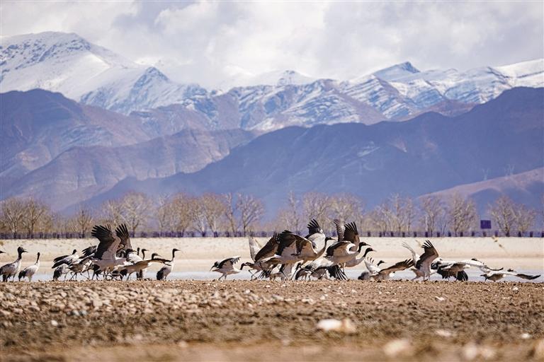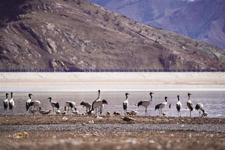 黑頸鶴是國家一級保護動物,在藏語中稱為“沖沖”。主要棲息在海拔2500米至5000米的高原、草甸、沼澤地帶。拉薩北部的林周縣平均海拔約4200米,是黑頸鶴的主要越冬地之一。最近這段時間,對拉薩市林周縣野保員們來說,一邊要忙自家的農活,一邊還要巡查候鳥情況。“已經(jīng)有一小部分飛走了,估計再過半個月都會陸續(xù)飛走?!?月23日上午,野保員旦增告訴記者,在虎頭山水庫和卡孜水庫越冬的候鳥有一部分已經(jīng)飛走了。野保員口中的“飛走”便是遷徙,遷徙是候鳥的本能,一年一年,跟隨時間的召喚,完成兩次遷徙:繁殖和越冬。