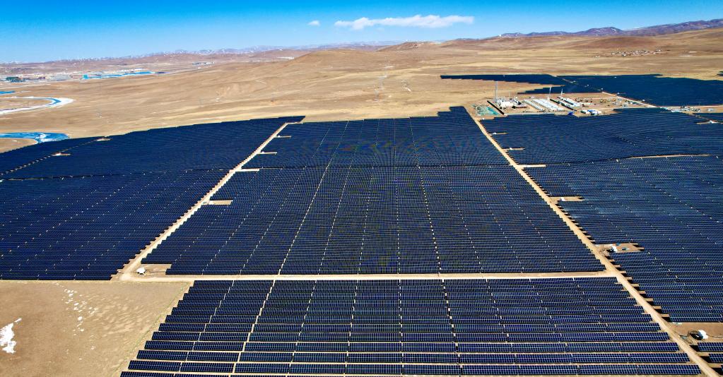 在海拔約4500米的那曲市色尼區(qū)甘丹康桑村,占地2200畝、25000多塊整齊排列的太陽能光伏組件在藍(lán)天白云的映襯下格外耀眼。