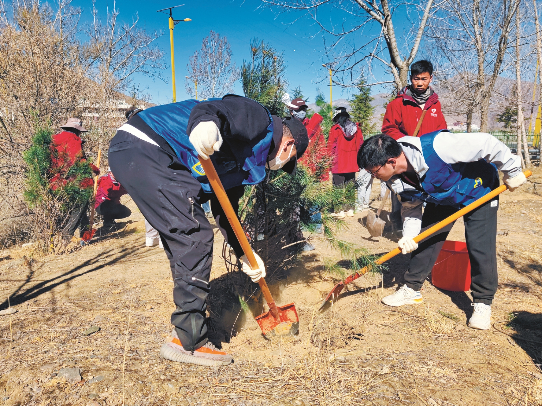 圖為大家一起立苗、填土、澆水,有條不紊完成每一道工序。 拉薩融媒記者 余洋洋攝
