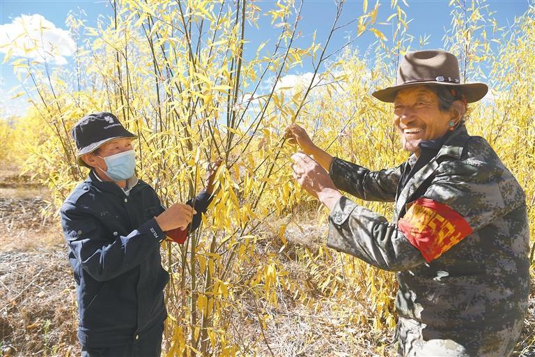 圖為日喀則市南木林縣雅江北岸生態(tài)示范區(qū)的護(hù)林員在查看苗木生長(zhǎng)情況。記者 李洲 攝