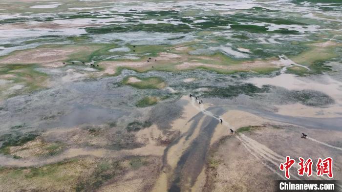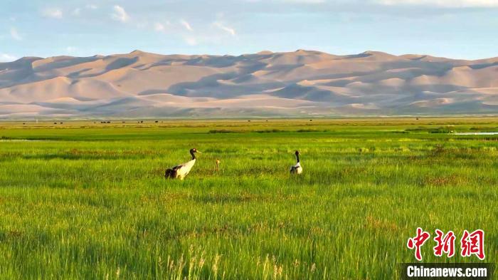 空中俯瞰阿爾金山國家級自然保護區(qū),芳草萋萋的依協(xié)克帕提濕地上,優(yōu)雅靈動的黑頸鶴夫婦正在教授新出生的黑頸鶴寶寶學習捕食的技巧;鶴群的不遠處,藏原羚一邊享受著多汁的青草,一邊好奇地打量著周圍的環(huán)境。