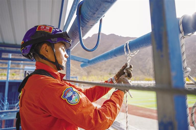 迅速打好繩結(jié)、扣好安全帶……27歲的仁增論珠身著全套戰(zhàn)訓(xùn)服,正在進(jìn)行繩索下降訓(xùn)練。身姿矯健、動作干凈利落,眨眼間,他已安全降至地面。仁增論珠從小就有個當(dāng)兵夢,2015年,他應(yīng)征入伍,三年部隊生活錘煉了他的體能和意志。2019年,仁增論珠入職自治區(qū)森林消防總隊,成為一名消防戰(zhàn)士,繼續(xù)為保家衛(wèi)國貢獻(xiàn)自己的力量。