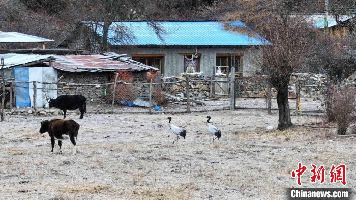 圖為西藏林芝市工布江達(dá)縣錯(cuò)高村里的黑頸鶴。扎頓 攝