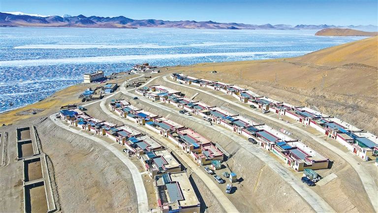 普莫雍錯(cuò)岸邊的推瓦村。記者 劉楓 武沛濤 攝