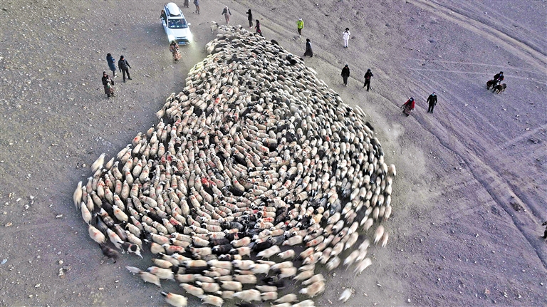 隨著趕羊進(jìn)度加快,“一”字形的羊群隊(duì)伍逐漸拉長(zhǎng)。浩浩蕩蕩的羊群用它們的身姿勾勒出一條緩緩移動(dòng)的金線,為這片蔚藍(lán)透亮的冰湖增添了生命的靈動(dòng)。