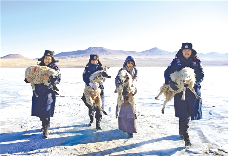 西藏出入境邊防檢查總站浪卡子邊境管理大隊(duì)民警幫助牧民將掉隊(duì)的綿羊抱往普莫雍錯(cuò)的湖心島。記者 王杰學(xué) 通訊員 彭維熙 攝