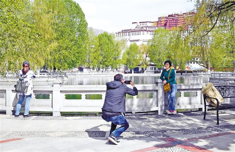 游客在布達(dá)拉宮廣場(chǎng)拍照留念。記者 旦增蘭澤 攝