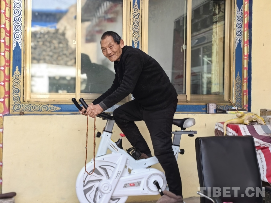 圖為卡貢村83歲的波拉正在家騎動感單車 攝影:王淑