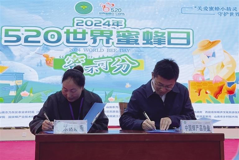 中國蜂產(chǎn)品協(xié)會領導與乃東區(qū)政府副區(qū)長宗巴(左)簽署共建“西藏山花蜂蜜之鄉(xiāng)”協(xié)議。記者 旦增玉珍 攝