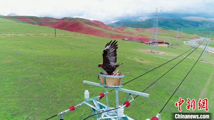 21日,在青海玉樹(shù)藏族自治州嘉塘草原,10千伏珍一路的67桿塔上,一只大鵟正在人工鳥(niǎo)巢內(nèi)孵化幼鳥(niǎo)。鳥(niǎo)巢下方,國(guó)網(wǎng)玉樹(shù)供電公司運(yùn)維檢修人員正在開(kāi)展巡檢工作。