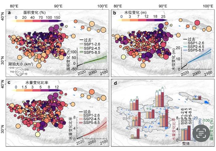 至21世紀(jì)末,中等排放情景下湖泊面積、水位和水量變化。中國(guó)科學(xué)院青藏高原研究所/供圖