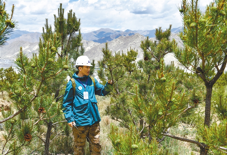 拉薩南北山綠化工程2024年度鞏固提升(貢嘎機(jī)場周邊山體)工程項(xiàng)目上,第三方監(jiān)理人員在檢查樹木狀況。新華社記者 晉美多吉 攝