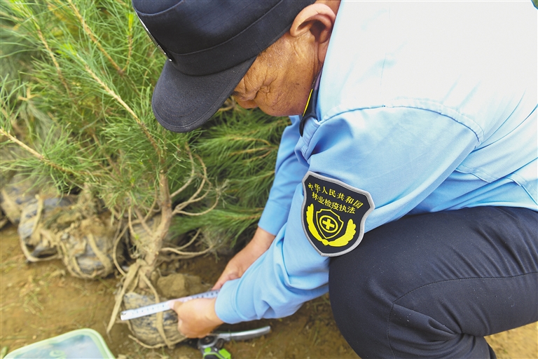 在拉薩南北山綠化工程2024年度鞏固提升(貢嘎機(jī)場周邊山體)工程項(xiàng)目上,林業(yè)檢疫執(zhí)法工作人員在檢查樹苗根部土球是否達(dá)標(biāo)。新華社記者 晉美多吉 攝