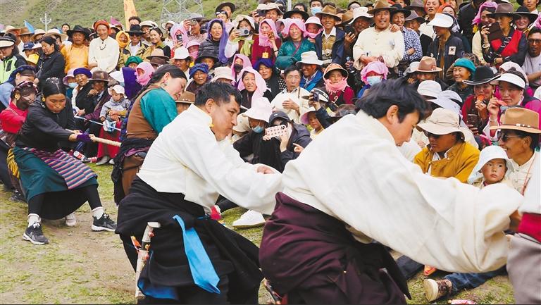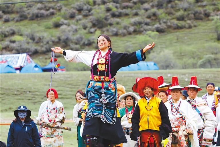 開幕式結(jié)束后,“春踏林周·悅賞杜鵑”——2024林周縣“春賞杜鵑”生態(tài)藝術(shù)共享季系列活動開始。為了給廣大游客提供專業(yè)的旅拍服務(wù),主會場的杜鵑花賞花點被巧妙地轉(zhuǎn)化為一個充滿自然韻味的“攝影棚”,并推出“非遺”服飾體驗,讓游客更深入地感受和體驗當(dāng)?shù)貍鹘y(tǒng)文化的魅力。同時,圍繞林周縣北部的生態(tài)環(huán)境、藝術(shù)人文和“非遺”文化等設(shè)計開展了徒步旅游活動,活動融合“農(nóng)文旅體”等內(nèi)容,從專業(yè)性的內(nèi)容植入、技能型的活動設(shè)計等方面來增強徒步旅游的品質(zhì)。旁多鄉(xiāng)的達(dá)龍藏戲、唐古鄉(xiāng)的熱振曲卓、阿朗鄉(xiāng)的“果諧”還給觀眾帶來了精彩的“非遺”表演。