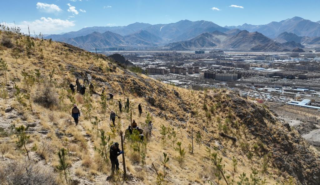 拉薩市東嘎社區(qū)二組村民在植樹(shù)(3月12日攝,無(wú)人機(jī)照片)。新華社記者 晉美多吉 攝