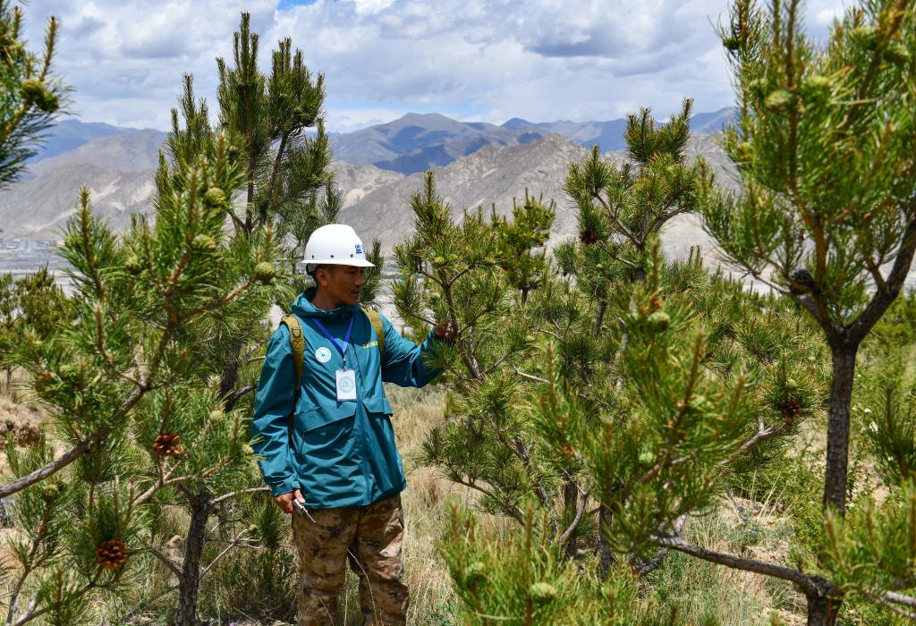 拉薩南北山綠化工程2024年度鞏固提升(貢嘎機(jī)場(chǎng)周邊山體)工程項(xiàng)目上,第三方監(jiān)理人員在檢查樹(shù)木狀況(6月3日攝)。新華社記者 晉美多吉 攝