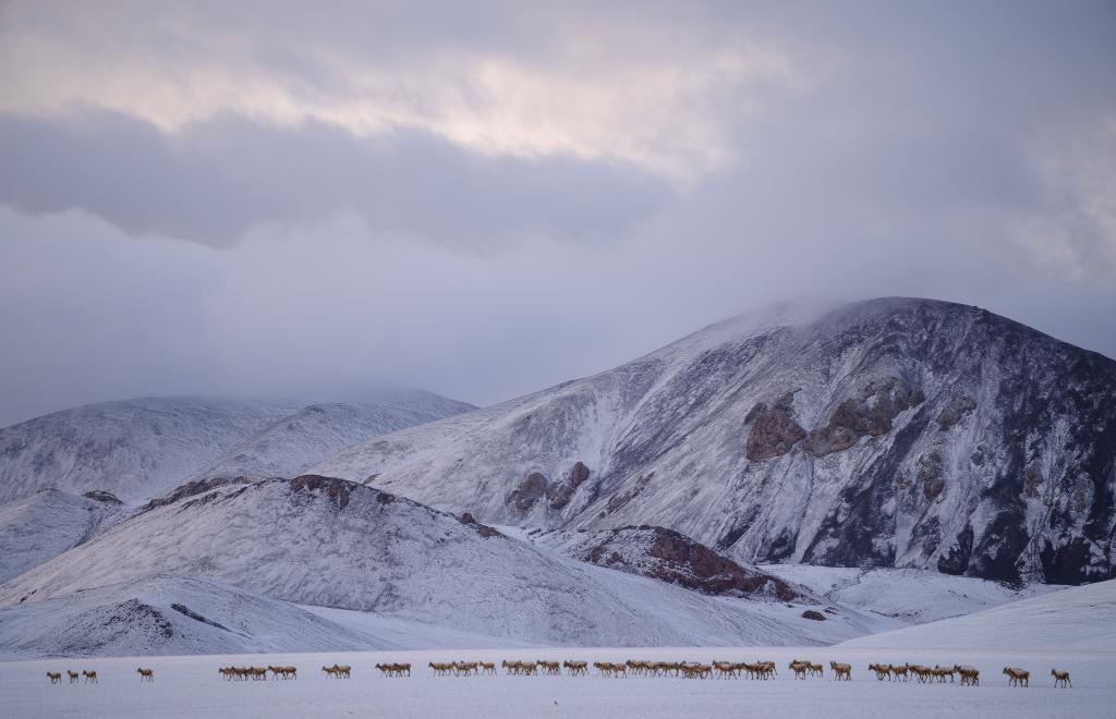 一群藏野驢在雪地中注視著遷徙的藏羚羊(5月8日攝)。