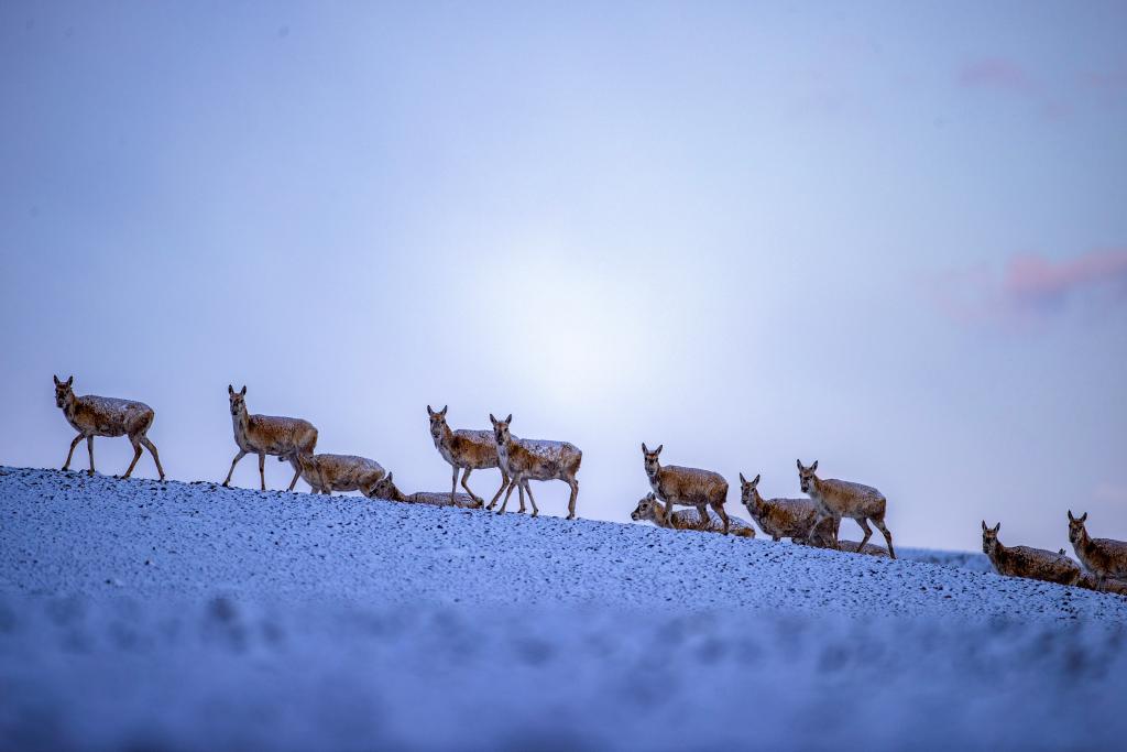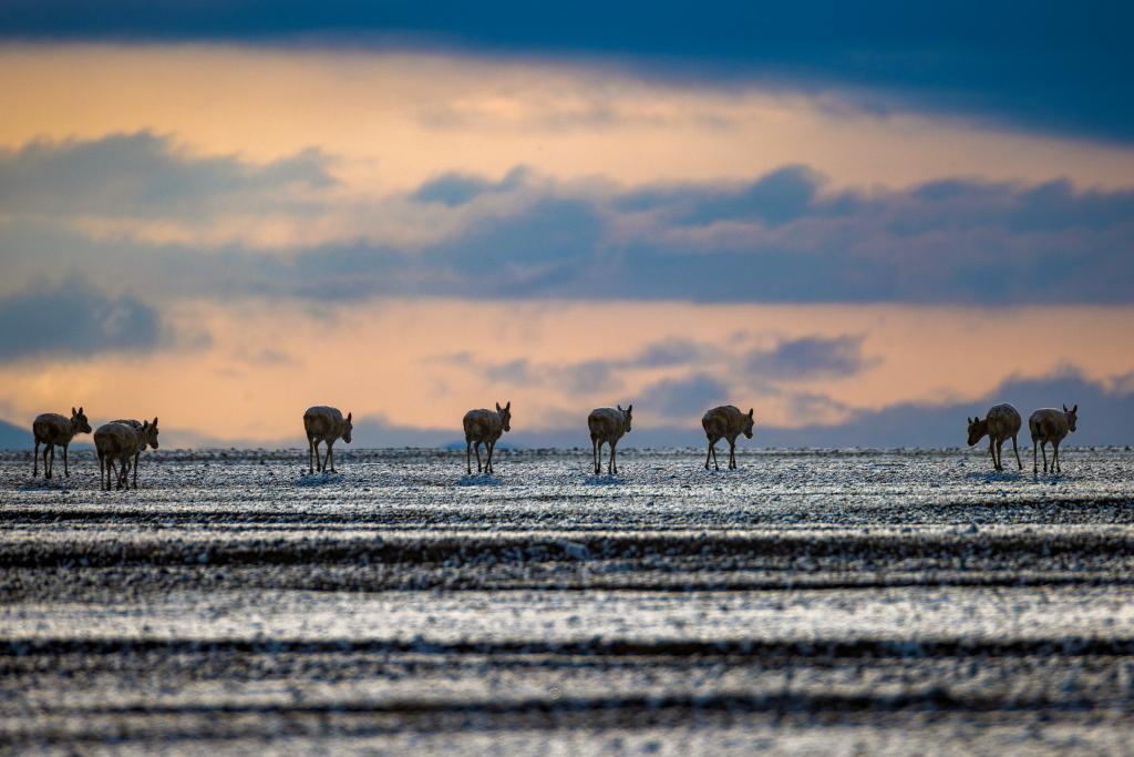 6月15日清晨雪后,在羌塘國家級自然保護(hù)區(qū),迎著朝霞前行在遷徙路上的一群藏羚羊。