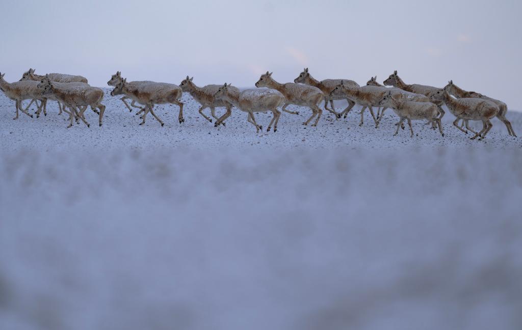 大群遷徙的藏羚羊途徑甜水河畔的荒灘雪地,向產(chǎn)羔地遷徙(6月15日攝)。