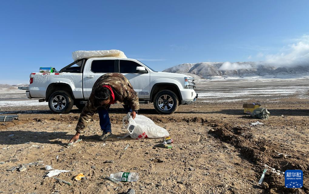 6月15日,格桑倫珠在撿拾宿營(yíng)地的垃圾,準(zhǔn)備裝車帶走。新華社記者 費(fèi)茂華 攝