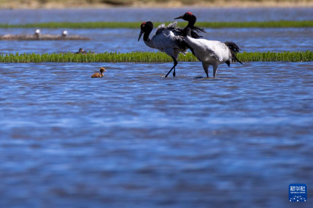 這是在那曲市申扎縣拍攝的養(yǎng)育雛鳥(niǎo)的黑頸鶴(6月9日攝)。新華社記者 晉美多吉 攝