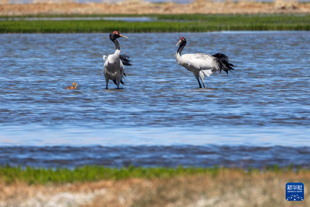 這是在那曲市申扎縣拍攝的養(yǎng)育雛鳥(niǎo)的黑頸鶴(6月9日攝)。新華社記者 旦增尼瑪曲珠 攝