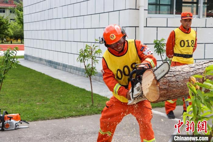 圖為察隅森林消防在比拼切割圓木。察隅森林消防 供圖