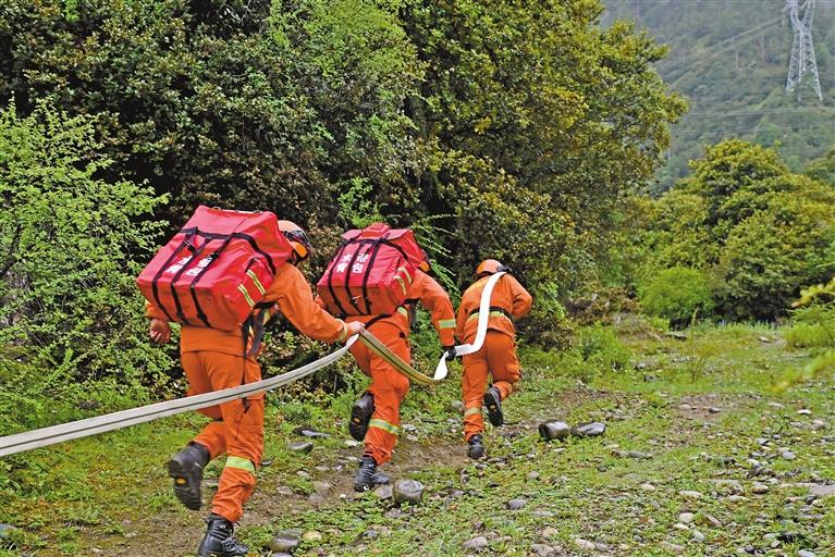 圖為森林消防員在鋪設(shè)管帶。記者 胡文 攝