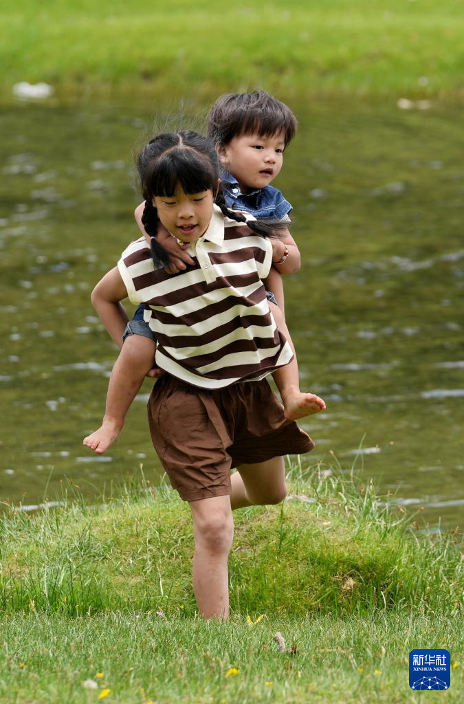 7月14日,孩子在“神秘樹林”水邊玩耍。新華社記者 張汝鋒 攝