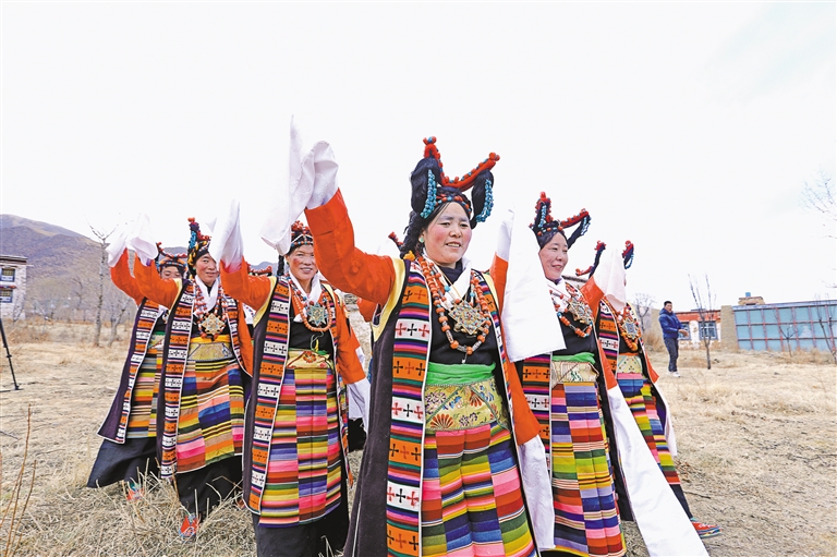 “如今,這支隊(duì)伍已發(fā)展到20多名成員,都是當(dāng)?shù)厝罕?。藝術(shù)隊(duì)經(jīng)常受邀參加各種大小晚會(huì)、重要節(jié)日演出和赴區(qū)內(nèi)外非遺展演等,其影響力和傳播力不斷提升,特別是甲瑪諧欽《和親路》受到廣泛歡迎?!奔赚斷l(xiāng)工作人員德吉卓嘎說(shuō)。
