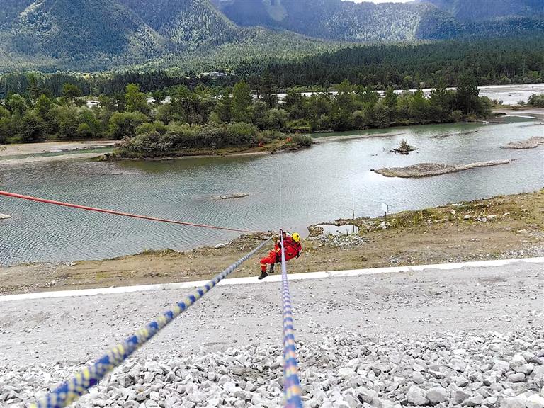 圖為波密縣森林消防中隊隊員開展橫渡孤島轉移救援演練。記者 張宇 攝