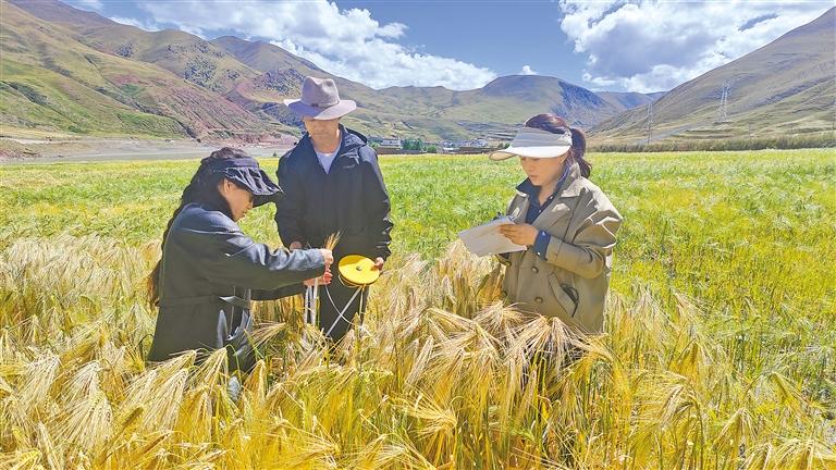 圖為比如縣相關(guān)工作人員在田間開(kāi)展青稞測(cè)產(chǎn)分析工作。記者 萬(wàn)靖 攝