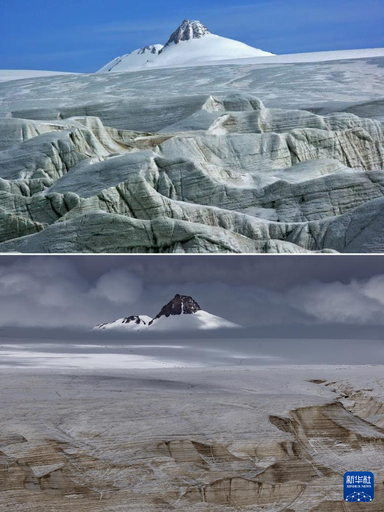 拼版照片:上圖為2009年6月拍攝的普若崗日主峰(新華社發(fā) 車剛攝);下圖為2024年9月4日拍攝的普若崗日主峰(新華社記者姜帆攝)。對(duì)比可以看出普若崗日主峰下的冰原消融嚴(yán)重。新華社發(fā)