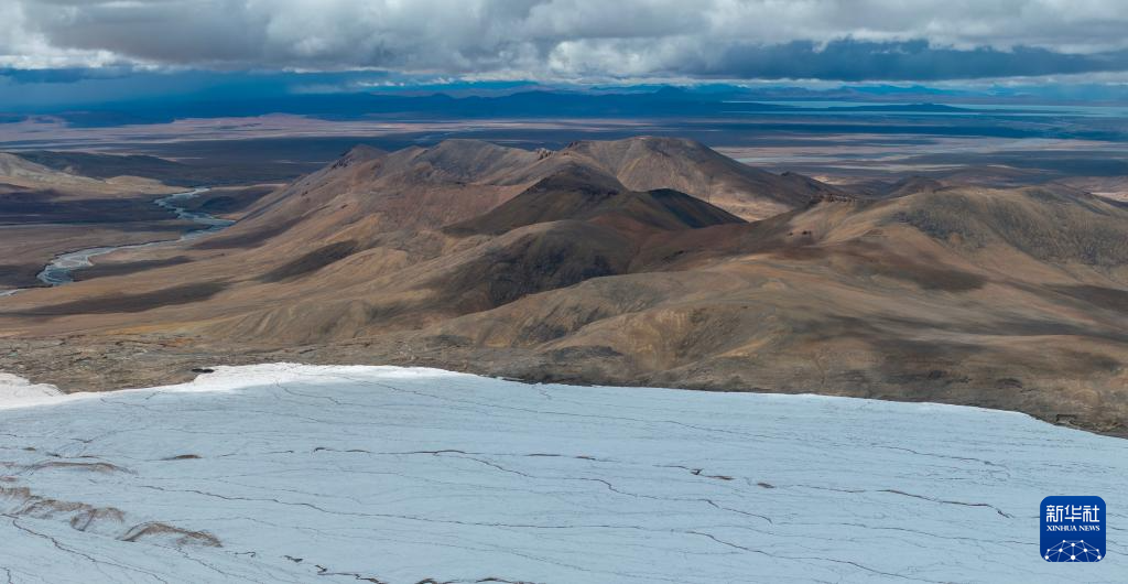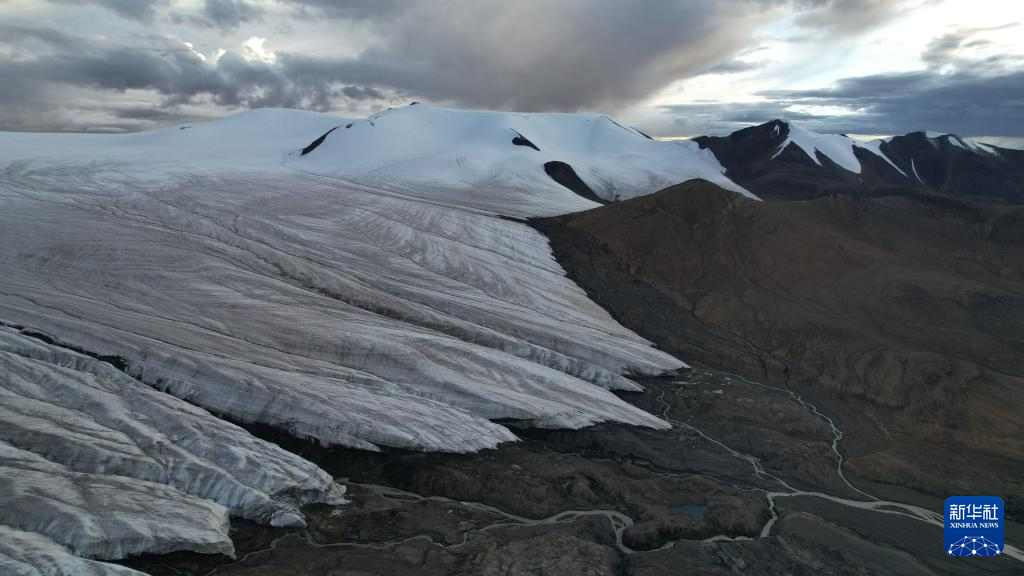 這是9月4日拍攝的普若崗日冰原8號(hào)冰川、消融形成的徑流以及遠(yuǎn)處的令戈錯(cuò)(無人機(jī)拼接照片)。新華社記者 姜帆 攝