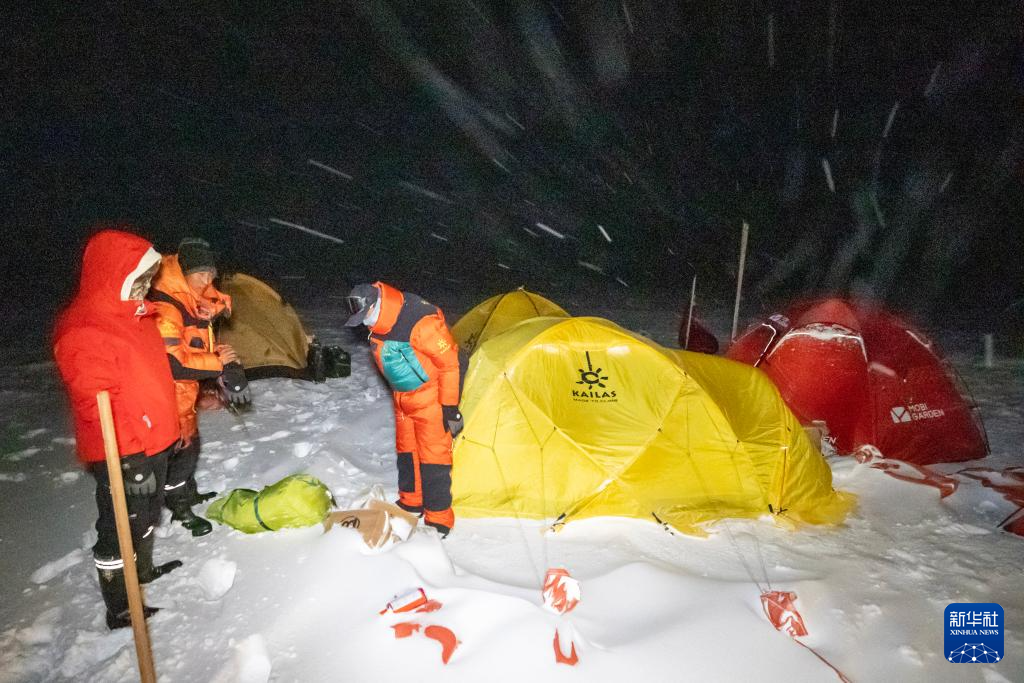 科考隊員在夜間的大風雪中加固營地(9月11日攝)。新華社記者 姜帆 攝