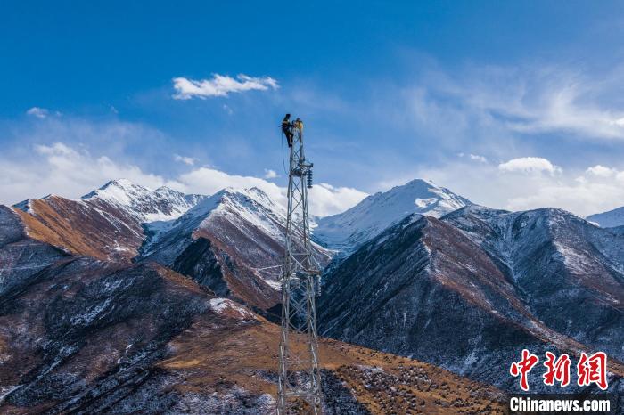 圖為2023年11月30日,西藏昌都電力施工人員在一條35千伏線(xiàn)路上開(kāi)展塔上作業(yè),其身后為茫茫雪山。趙清鵬 攝