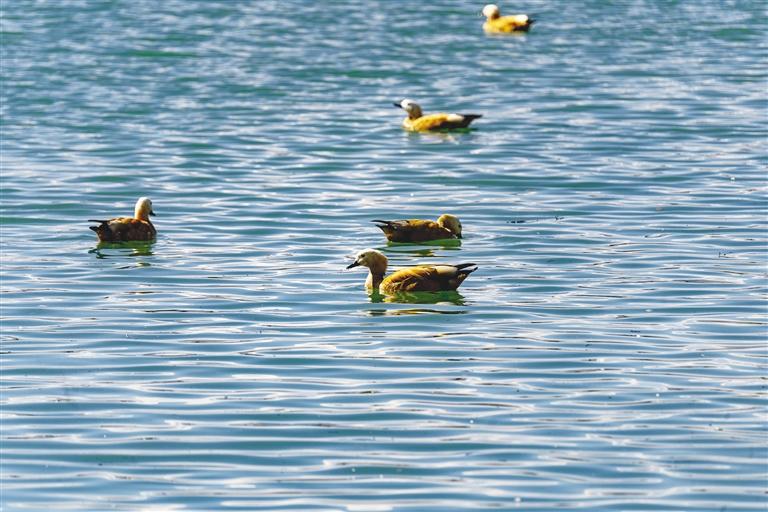 開闊的河面上,斑頭雁、黃鴨、赤麻鴨等鳥類往來于此,此起彼伏的叫聲不絕于耳。在陽光的照射下水面波光粼粼,候鳥或嬉游、或覓食、或追逐,這一和諧優(yōu)美的景象,引得不少觀賞的市民和游客舉起手機或相機記錄。
