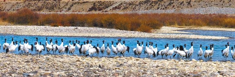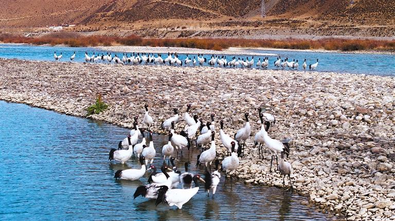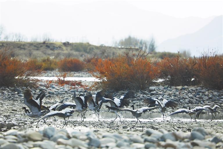 記者觀察到,黑頸鶴在龍雪河谷旁時而低頭覓食,時而閑庭信步,時而揮翅舒展,它們的身影與遠處成群結(jié)隊的牛馬、皚皚雪山以及清澈的湖水互交互織,構(gòu)成了一幅人與自然和諧共生的美好畫卷。