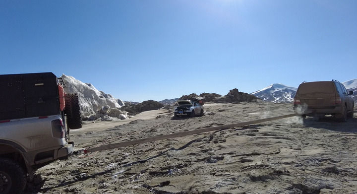 可可西里巡山隊隊員在巡山過程中用拖車?yán)K拉出被困車輛(2025年1月14日攝)。新華社發(fā)(杜笑微攝)