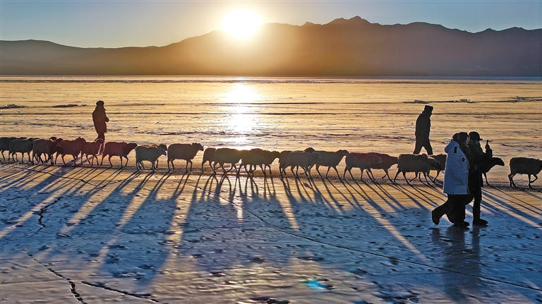 朝陽下,羊群在牧民和民警的保護(hù)下前往湖心島牧場(chǎng)。(圖片均由記者 旦增蘭澤 平措次仁 晉巴次成 武沛濤 攝)
