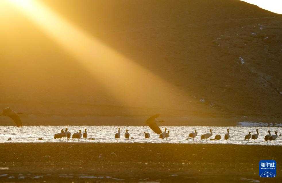2月20日清晨,第一縷陽(yáng)光照耀在西藏拉薩市林周縣越冬的黑頸鶴身上。新華社記者 晉美多吉 攝