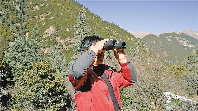 貢覺縣則巴鄉(xiāng)夏日村的護林員用望遠鏡眺望巡查林區(qū)。記者 貢秋曲措 通訊員 董燕 西繞丹青 攝