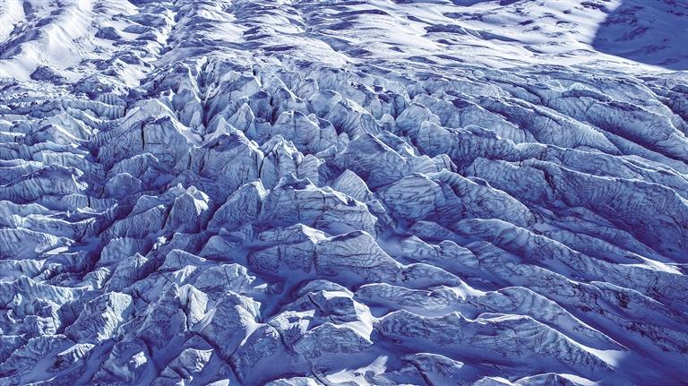 冰川突兀地橫亙?cè)谏焦戎?,斷裂面閃爍著冷白的光芒。冰舌邊緣布滿裂痕,表層泛著松石般的色澤,陰影處則沉淀成深邃的藍(lán)色。微風(fēng)拂過冰面,一股清冷又帶著泥土芬芳的氣息撲面而來。