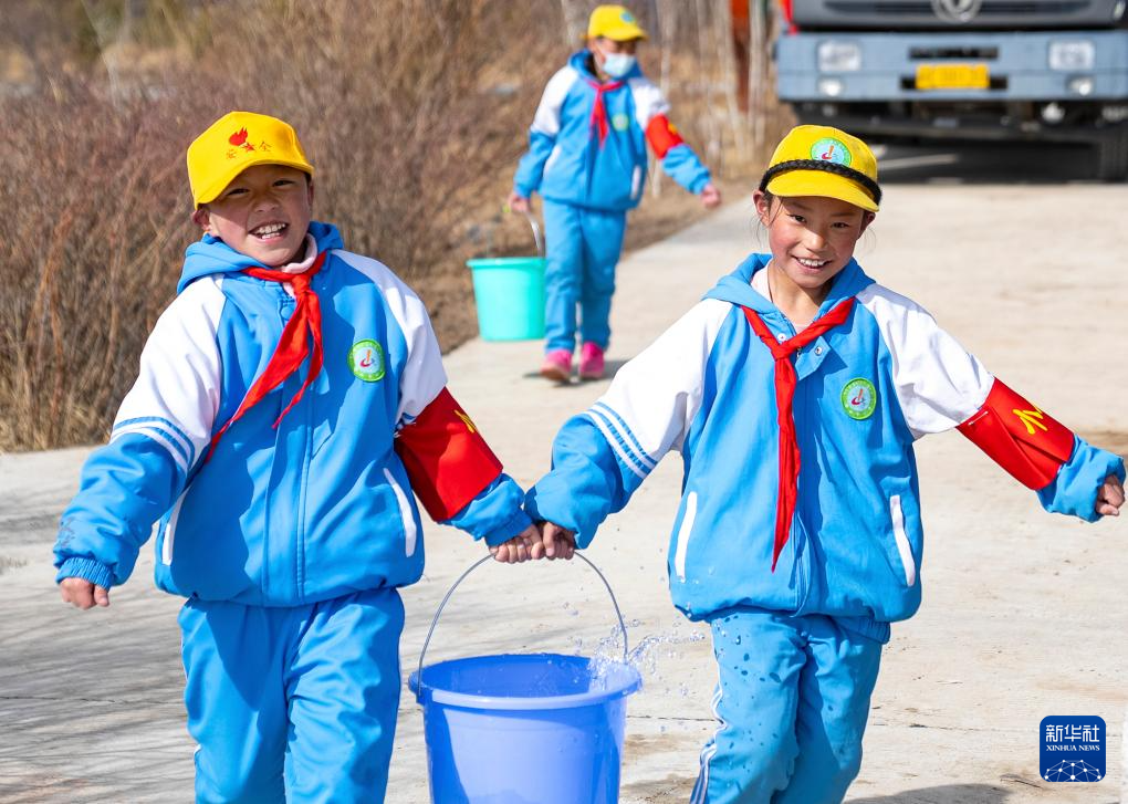 4月25日,幾名那曲市小學四年級學生在搬水準備給樹苗澆水。新華社記者 丁增尼達 攝