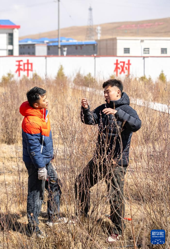 4月25日,那曲市林業(yè)和草原局工作人員在查看樹苗長勢。新華社記者 丁增尼達 攝