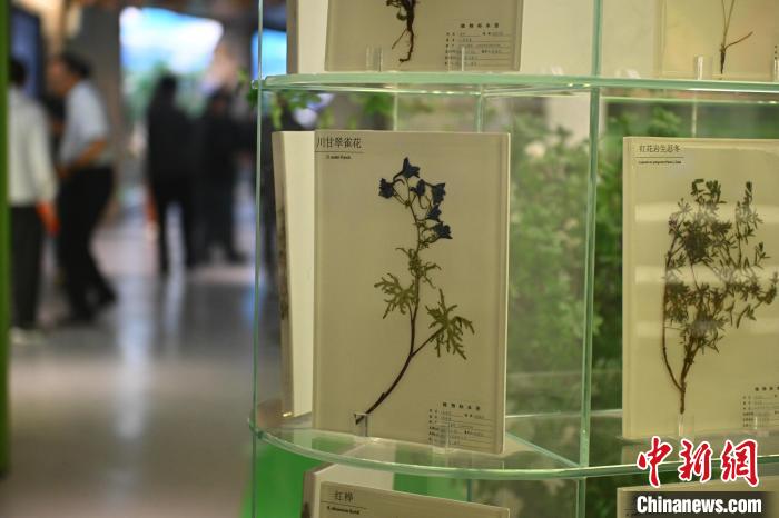 6月16日,在位于甘肅省張掖市肅南裕固族自治縣的祁連山國家公園自然博物館展陳的川甘翠雀花標(biāo)本與紅花巖生忍冬標(biāo)本。中新社記者 李亞龍 攝